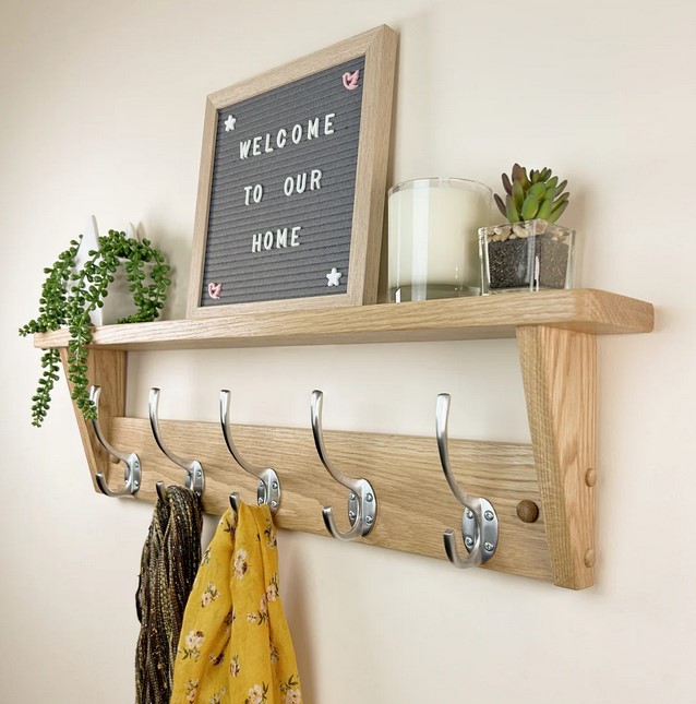 Pair wood with metal brackets or pipes to achieve an industrial look. Use dark-stained wood for the base and combine it with matte black or steel hooks to create a bold contrast. This design works well in modern lofts or urban-style apartments.